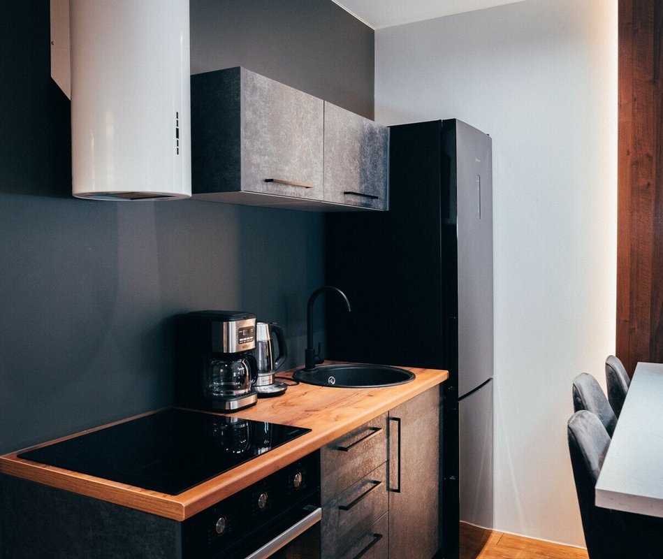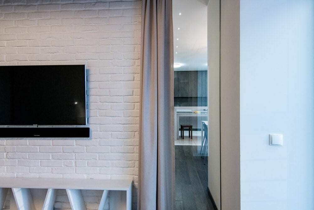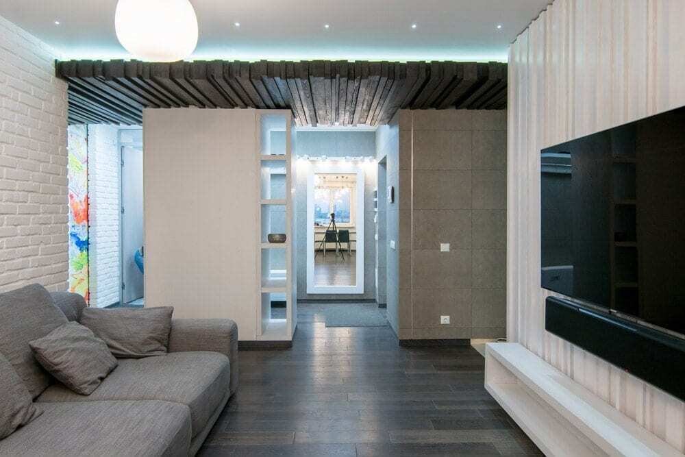 Важнее нам была не красота, а именно практичность, потому что квартира маленькая, всего 28 квадратов. Дизайнер очень круто расположила мебель и технику, отделили спальную зону деревянной ширмой, в итоге все же очень красиво получилось! И функционально!